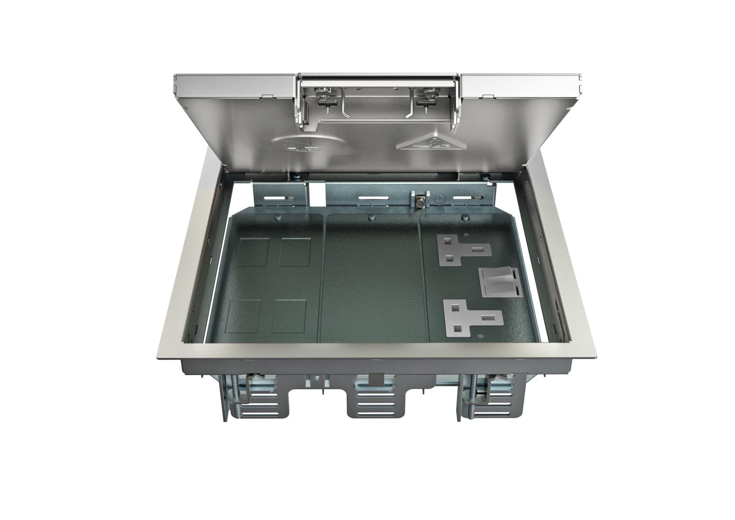 Tampa de encastramento com pega, de 3 compartimentos, para a instalação de suportes de aparelhos MT9. Podem ser instalados 3 espelhos do modelo APMT2.