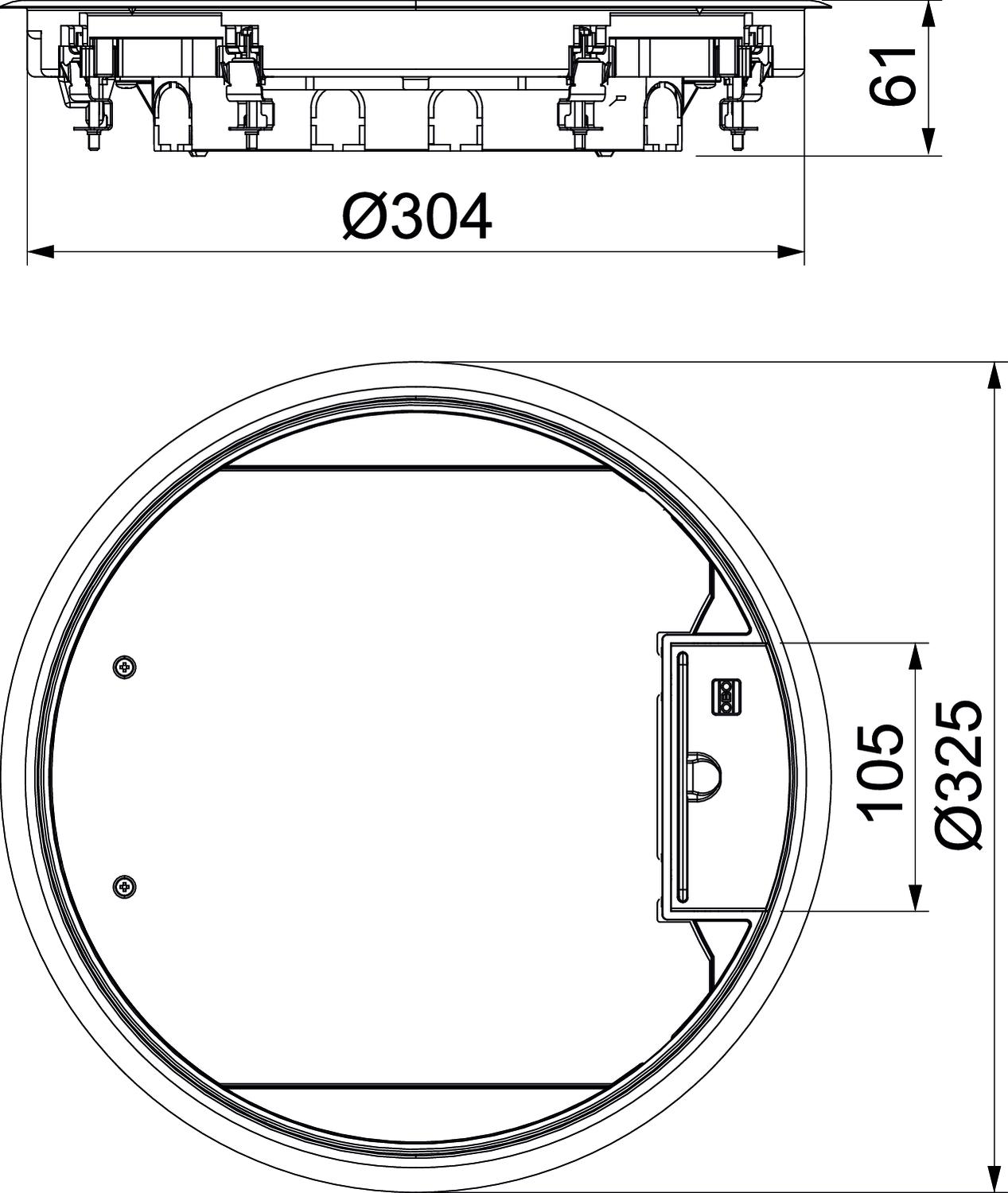 Altura 61 mm Altura do pavimento mín. 55 mm Altura mín. do pavimento 58 mm Apropriado para calha de chão fechada no pavimento sim Apropriado para calha de instalação no pavimento sim Apropriado para calha de pavimento para betonilha sim Apropriado para instalação de pavimento côncavo sim Apropriado para instalação em chão falso sim Apropriado para tratamento a húmido não Carga vertical, grande área até 5.000 N Carga vertical, pequena área até 3.000 N Com espaço para revestimento do pavimento não Comprimento 325 mm Cor preto; RAL 9011 Diâmetro de instalação 304 Diâmetro exterior 325 mm Dimensão Ø325x61 Espessura do revestimento do pavimento 5 mm Estrutura de proteção do pavimento sim Intervalo de aperto D máx. 28 mm Intervalo de aperto D mín. 10 mm Largura 325 mm Material Poliamida Mecanismo de abertura Pega Modelo para cargas pesadas não Número dos aparelhos a instalar 8 Pegada de CO2 (GWP) do berço ao portão 7,7792 kg CO2e / 1 Peça Possibilidade de montagem de vedante não Profundidade de instalação 58 mm Suporte para instalação de suportes de aparelhos. não Tamanho nominal para unidades de montagem de aparelhos R9 Tratamento do pavimento seco Versão redondo Versão da saída de cabos Saída de cabos oscilável - Todos os tipos