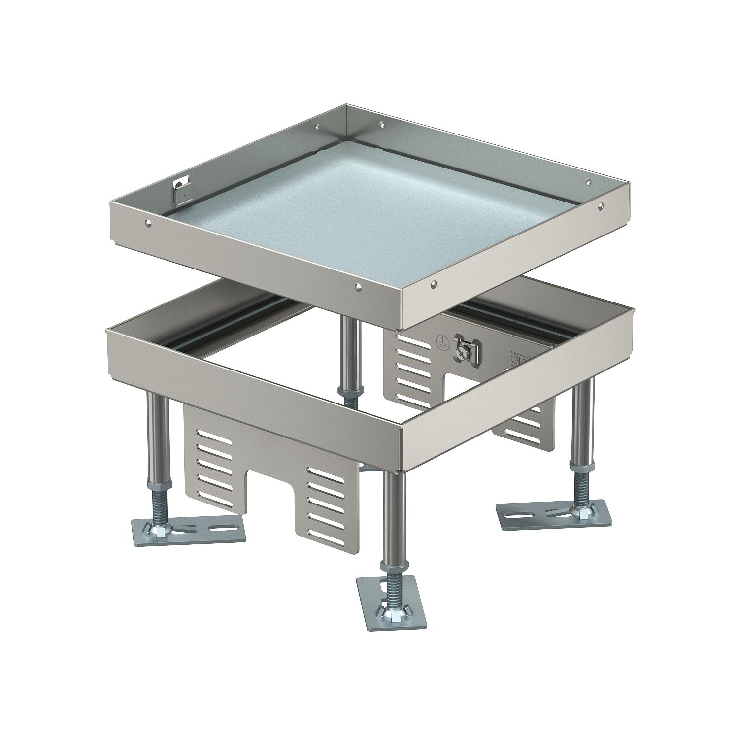 Descrição do produtoTampa quadrada nivelável "cega" para a criação de uma abertura de inspeção de tamanho nominal 4. Montagem em sistemas de calhas, chãos falsos, em pavimentos tratados a seco ou a húmido em interiores. Apenas adequada para pavimentos lisos. Classe de proteção: IP X5.