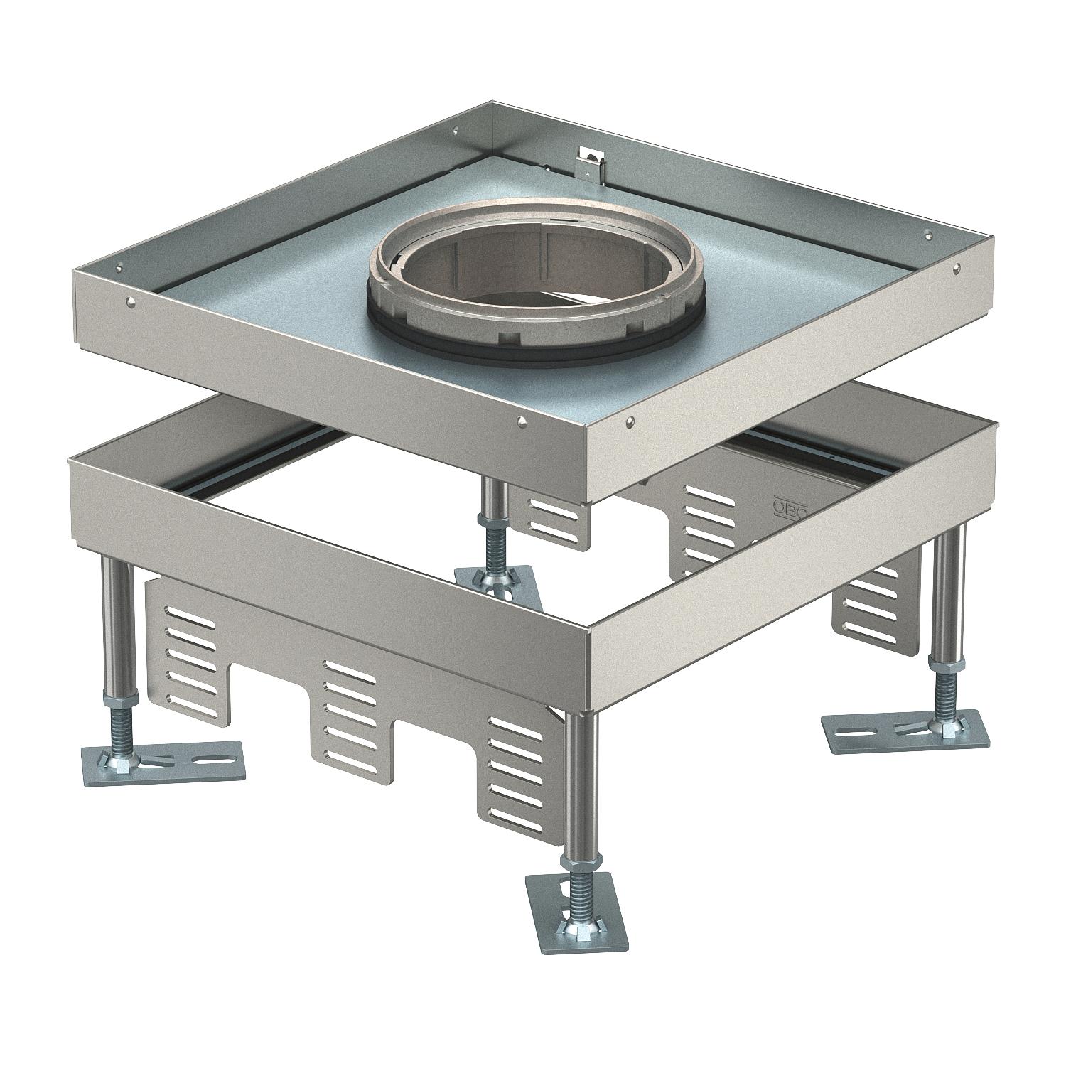 Tampa quadrada nivelável de grandes cargas para tubo periscópio de tamanho 9, para a montagem de aparelhos de instalação em sistemas de calhas e chão falso, em pavimentos de limpeza a seco ou a húmido em interiores. Classe de carga 1 a 10 kN.