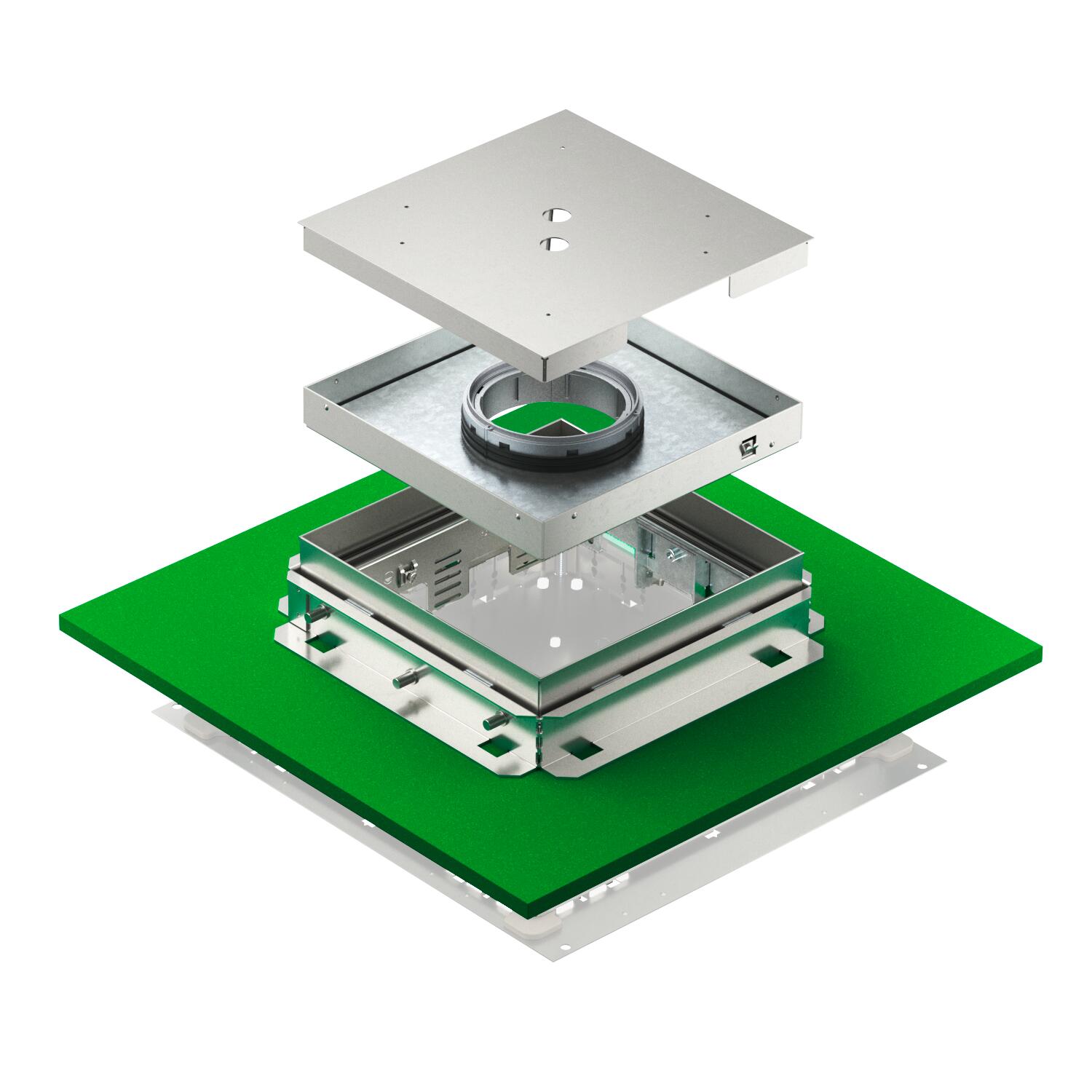 Height-adjustable cassette with tube body. For the installation of 3 universal supports UT4 for 9 single installation devices with support ring/support clamp or 12 Modul 45® devices. The delivery includes a screed protection lid made from aluminium (can be sanded), a matching mounting lid for fixing the cassette tube body and an ISO apron for the decoupling of the underfloor connection socket. The tube body is not included in the scope of delivery.