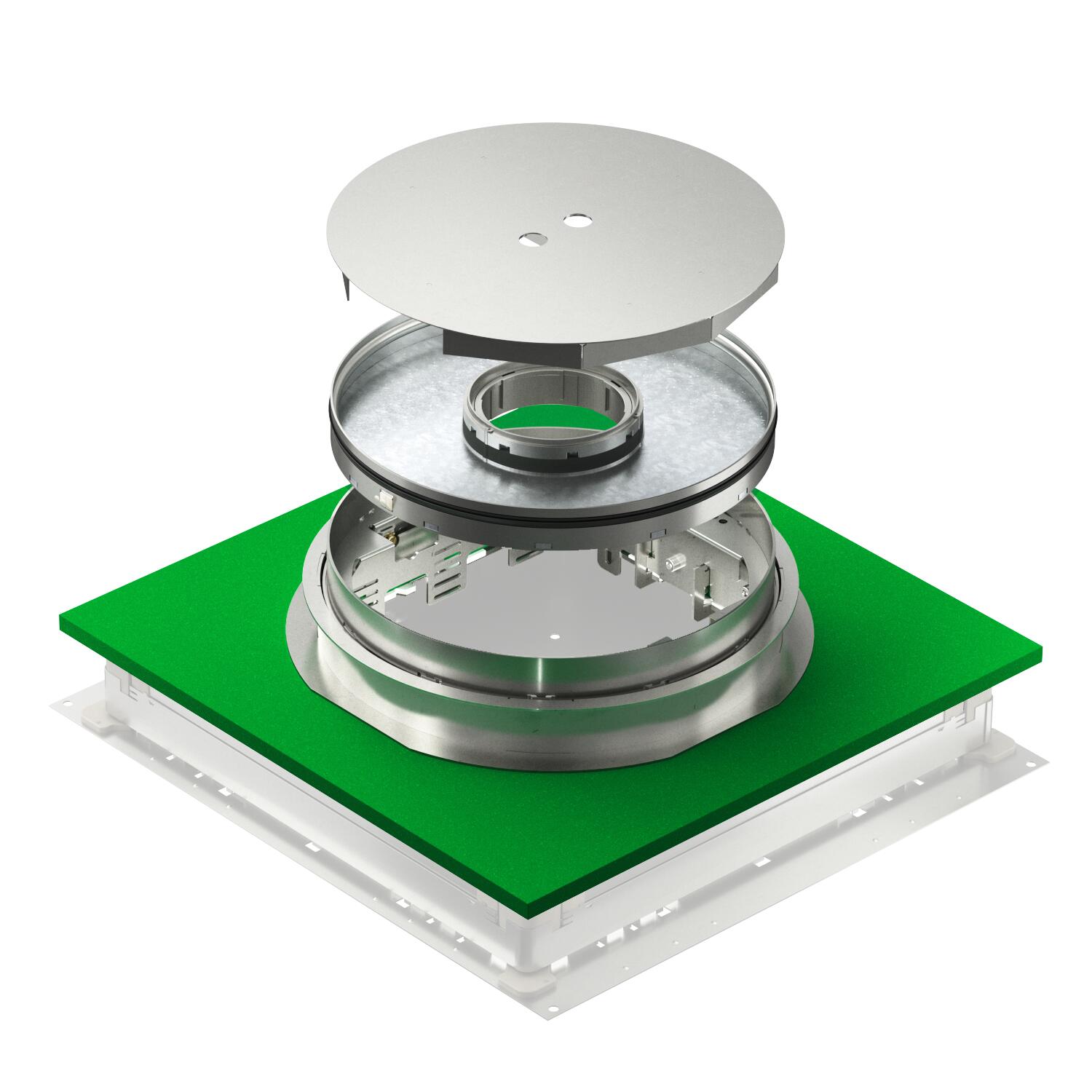 Height-adjustable cassette with tube body. For the installation of 3 universal supports UT4 for 9 single installation devices with support ring/support clamp or 12 Modul 45® devices. The delivery includes a screed protection lid made from aluminium (can be sanded), a matching mounting lid for fixing the cassette tube body and an ISO apron for the decoupling of the underfloor connection socket.