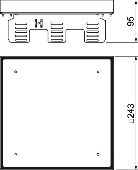 Descrição do produtoTampa "cega" nivelável e desacoplada do piso para criar uma abertura de inspeção de tamanho nominal 9 em pavimentos tratados a seco ou húmido em interiores, para a montagem em caixas de pavimento UZD250-3 ou UZD350-3, em cada caso em conjunto com um aro de redução DUG../9 ou em UGD250-3/9 ou UGD350-3/9. A montagem é efetuada através de niveladores (encomendar separadamente) no perfil da estrutura de alumínio das caixas de pavimento. Apenas adequada para pavimentos lisos.