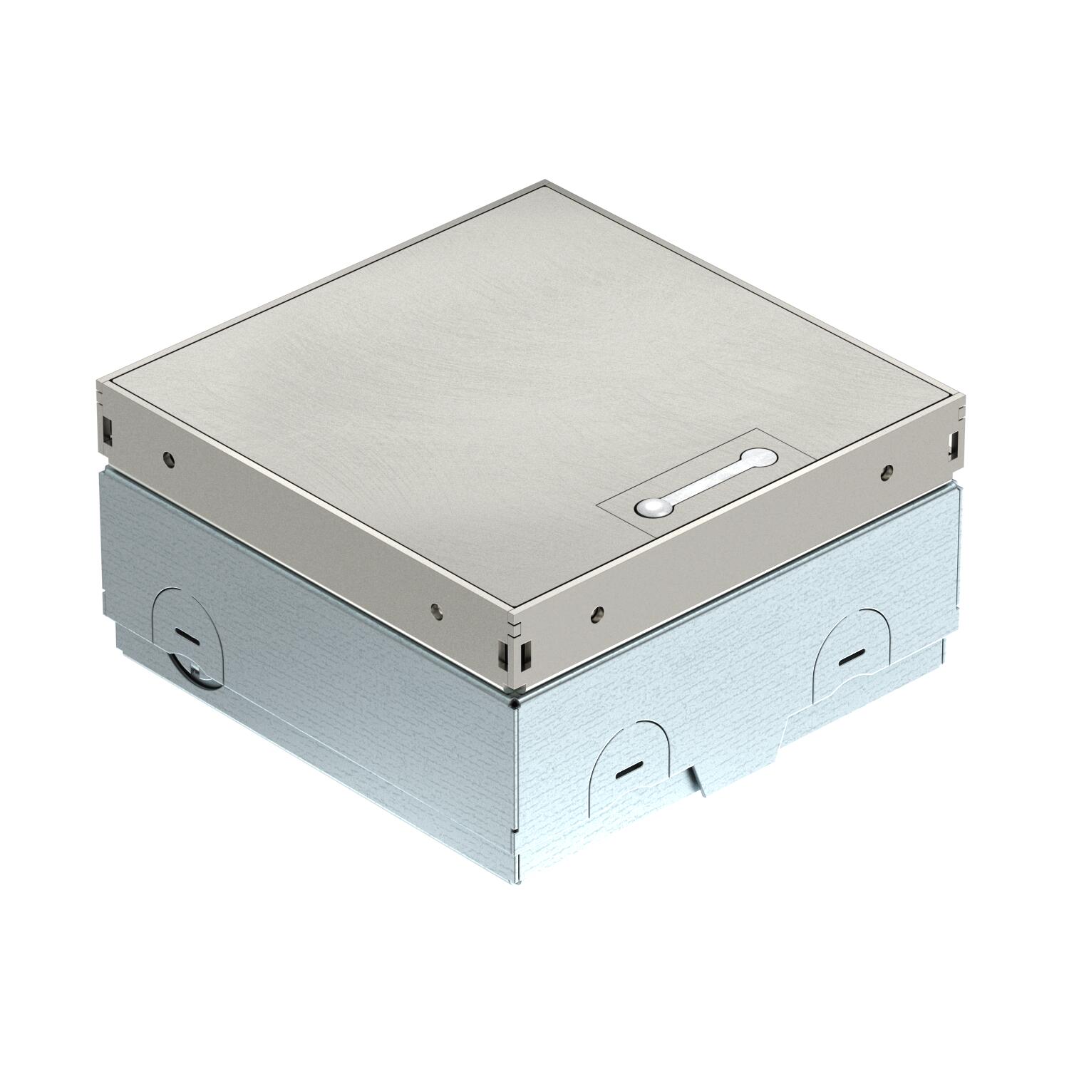 Descrição do produtoCaixa de pavimento quadrada para utilização em sistemas de limpeza a seco e pavimentos de betonilha em áreas interiores. Caixa com aberturas de entrada para tubos (M20/M25). Tampa ajustável ao rebordo superior do revestimento do pavimento, através de 4 apoios de nivelamento. A profundidade mínima de montagem é de 75 mm, a amplitude de nivelamento + 30 mm. Estrutura e tampa de aço inoxidável visível no revestimento do pavimento. Tampa com placa decorativa e saída de cabos com escova. A capacidade de carga de 15 kN só é garantida quando não está a ser utilizada. Caixa vazia para um aparelho de instalação Modul 45® e um conector de dados. Quando entregue, fechada com uma placa cega.