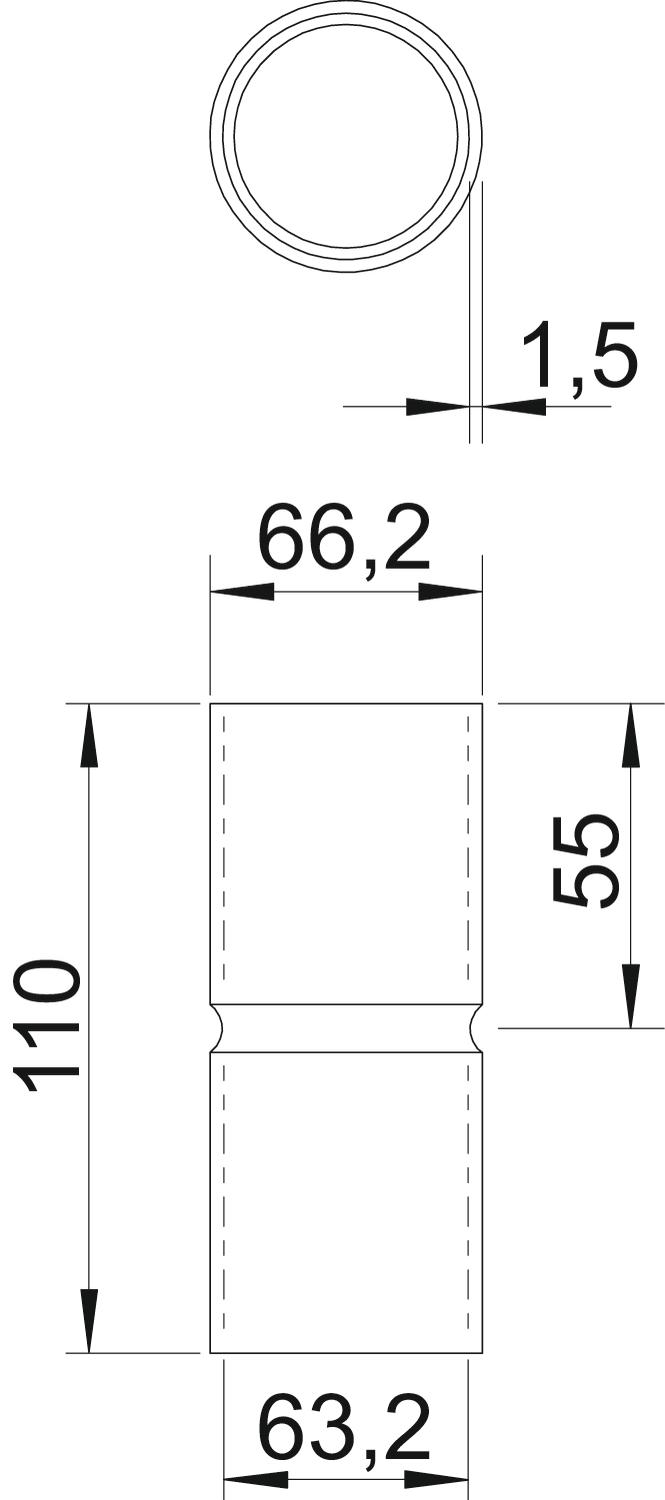 Com escotilha de inspeção e tampa não Comprimento 110 mm Dimensão Ø63mm Duas peças não Gama de temperaturas de aplicação máx. 250 °C Gama de temperaturas de aplicação mín. -45 °C Livre de halogéneos sim Material Alumínio Medida d 63,2 mm Medida D 66,2 mm Medida l 55 mm Medida L 110 mm Medida t 1,5 mm para diâmetro de tubo 63 mm Superfície escovada não Superfície polida não Tamanho 63 Versão Encaixe - Todos os tipos