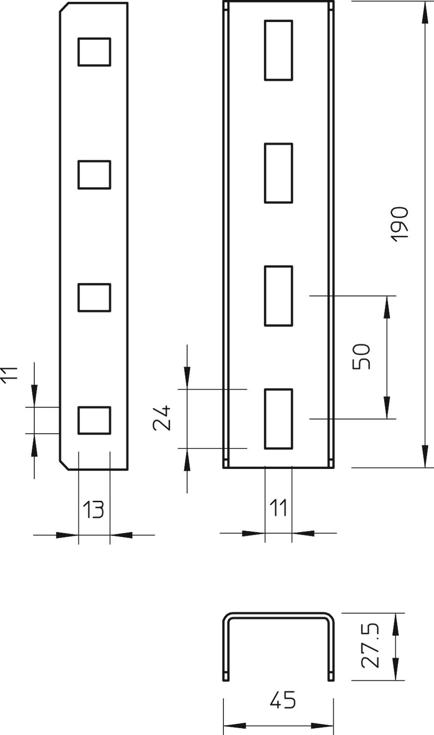 Adequado para formas do perfil Perfil U Altura 27,5 mm Com acessórios de parafusos sim Comprimento 190 mm Cor aço inoxidável Dimensão 27,5 x 45 x190 Dimensão 190x45 Distância cêntrica entre os furos 50 mm Largura 45 mm Material Aço inoxidável 1.4571 Pegada de CO2 (GWP) do berço ao portão 2,8545 kg CO2e / 1 Peça Superfície brilhante, pós-tratamento - Todos os tipos