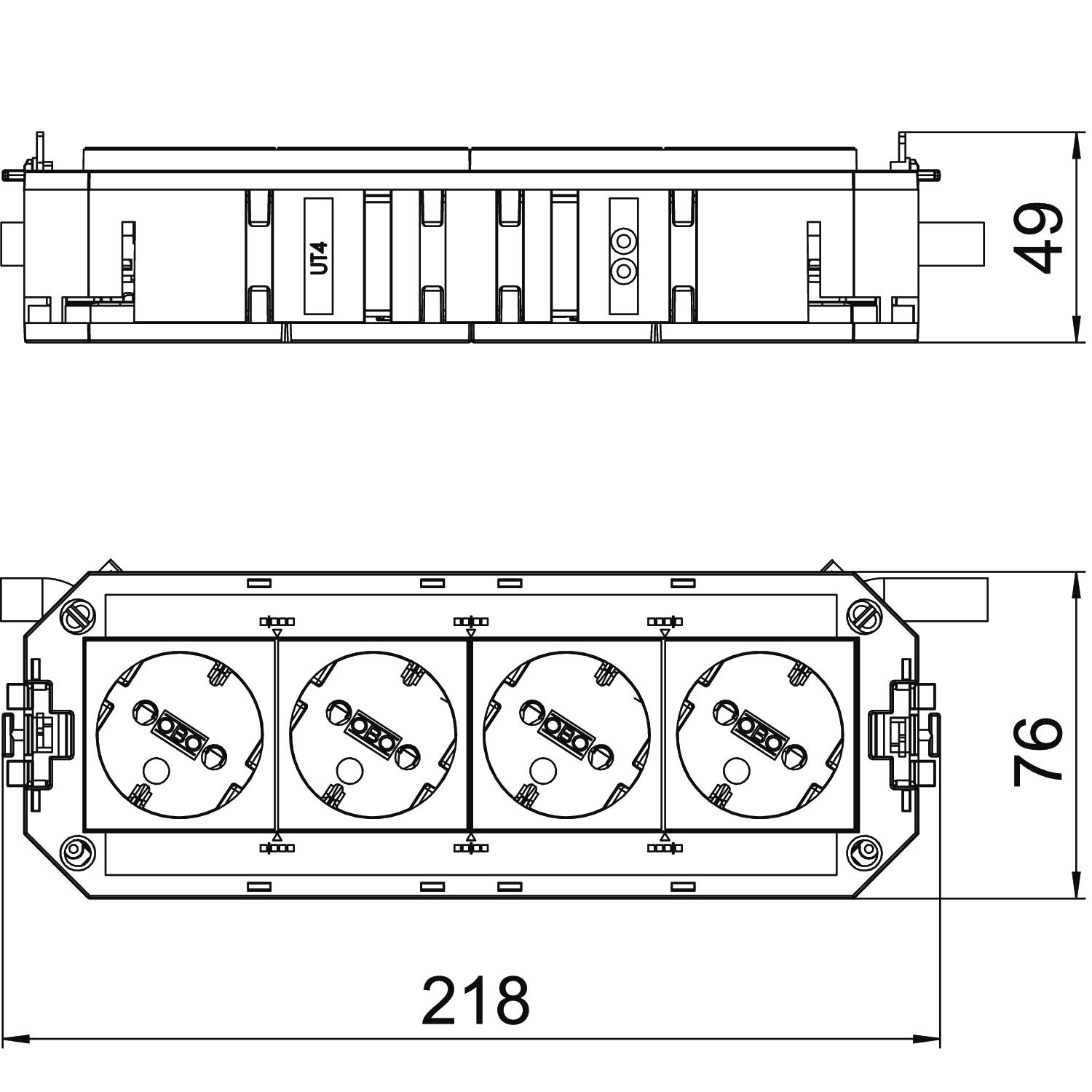 O suporte universal UTC4 pronto para ligação possui 2 tomadas de contacto de segurança 33° pré-instaladas em branco e 2 tomadas de contacto de segurança 33° pré-instaladas em laranja, 250 V~ 16 A .