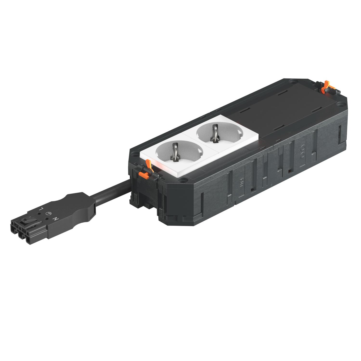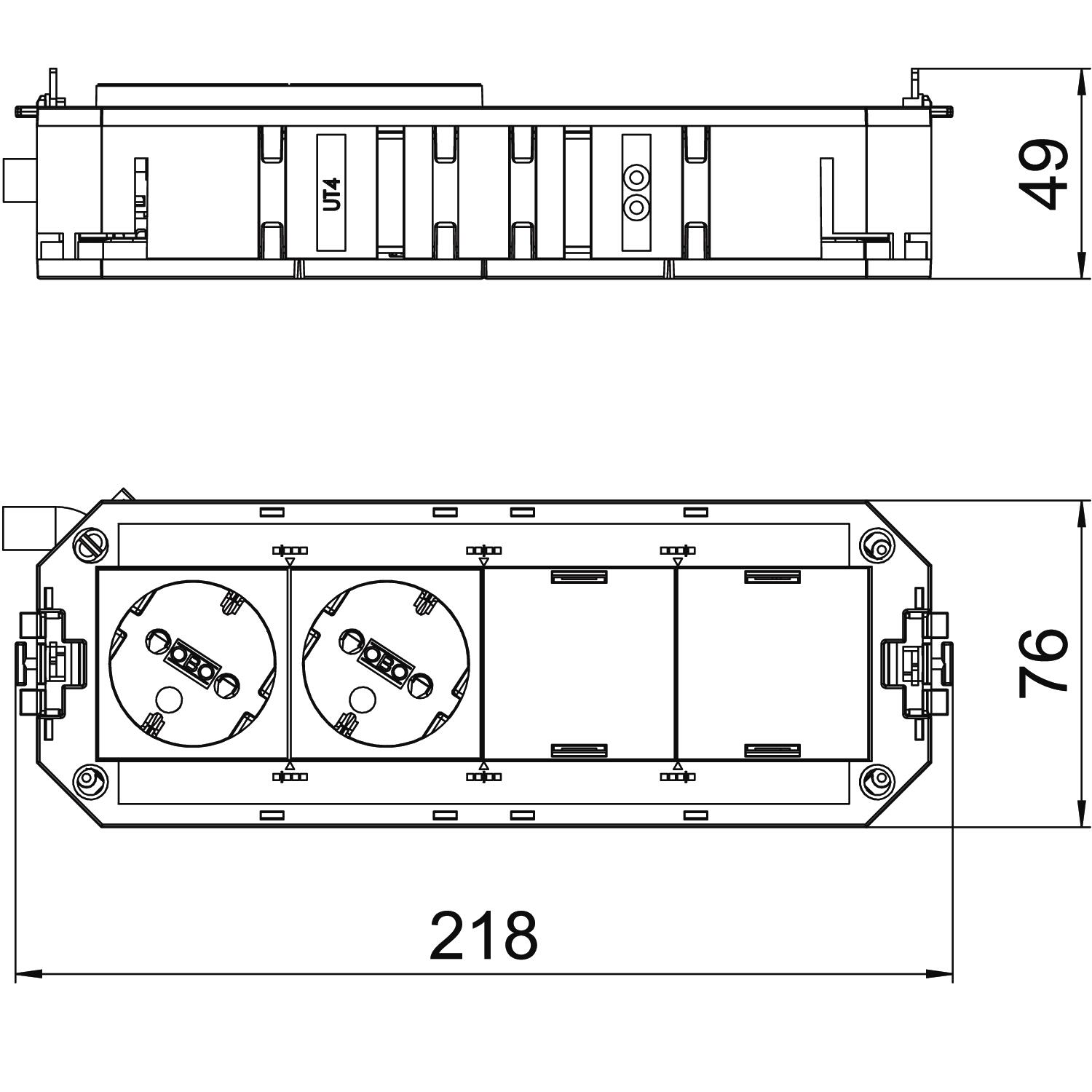 O suporte universal UTC4 pronto para ligação possui 2 tomadas de contacto de segurança 33° pré-instaladas em branco e 2 obturadores para a montagem posterior de 2 aparelhos de instalação da série Modul45.
