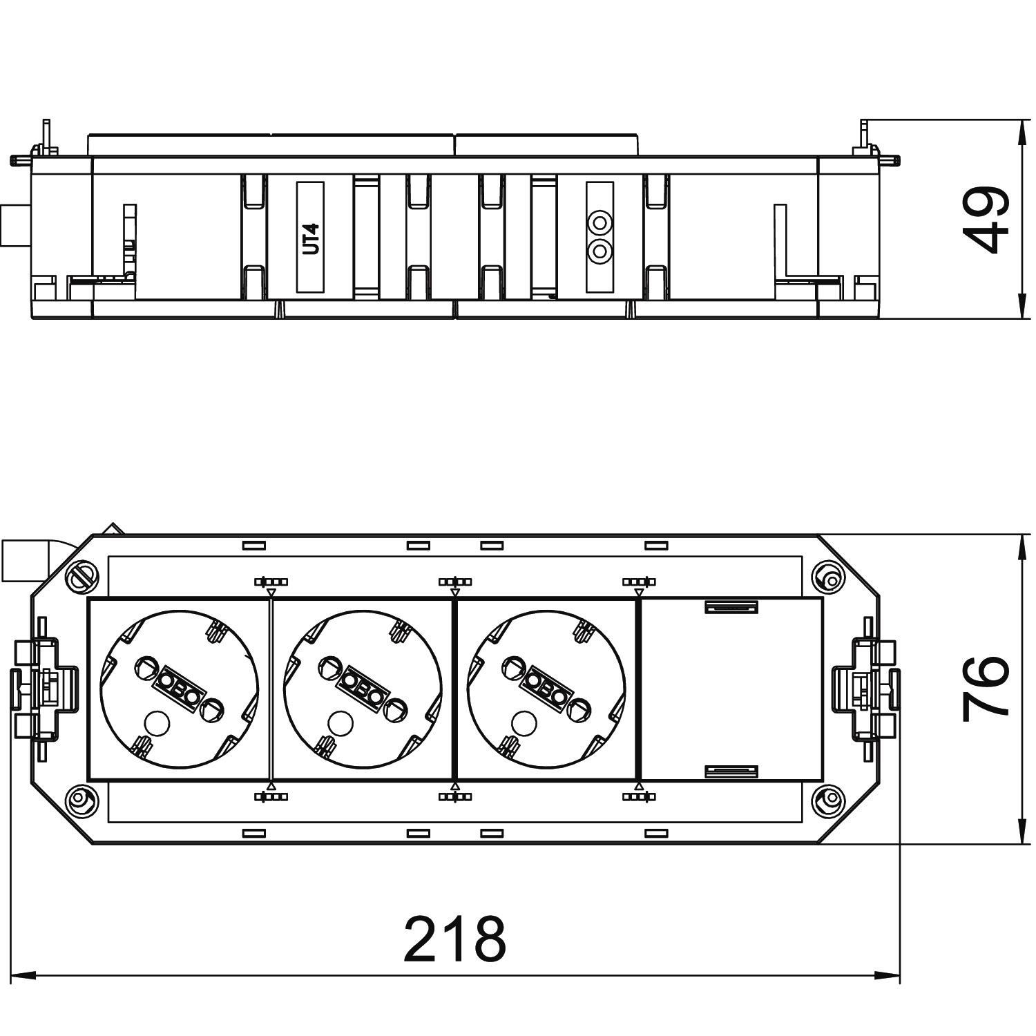 O suporte universal UTC4 pronto para ligação possui 3 tomadas de contacto de segurança 33° pré-instaladas em branco e um obturador para a montagem posterior de um aparelho de instalação da série Modul45.