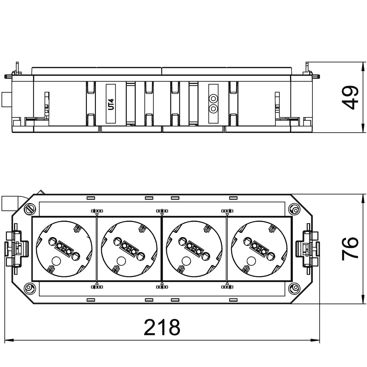 O suporte universal UTC4 pronto para ligação possui 4 tomadas de contacto de segurança 33° pré-instaladas em branco, 250 V~ 16 A .