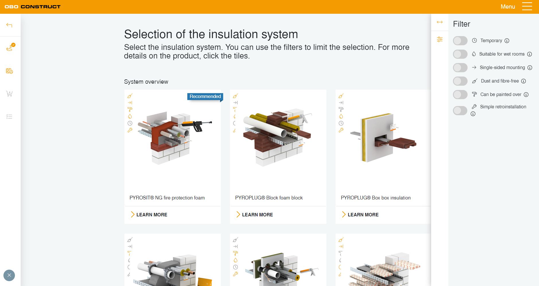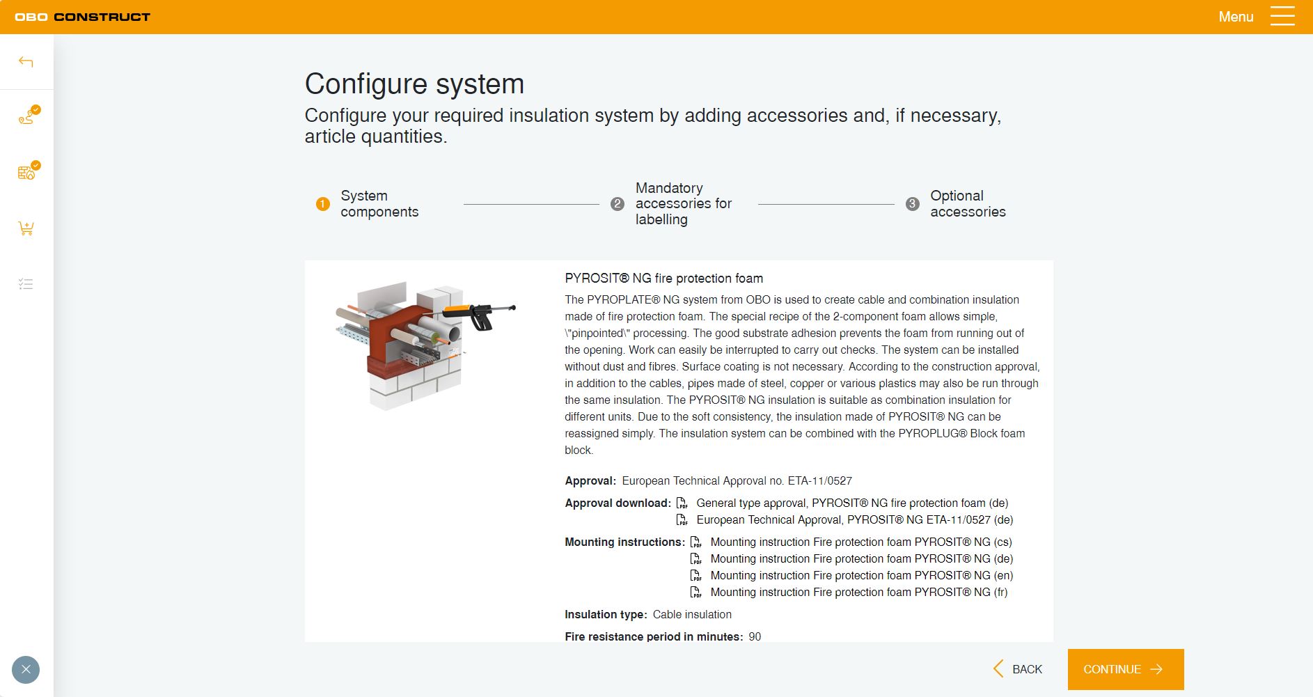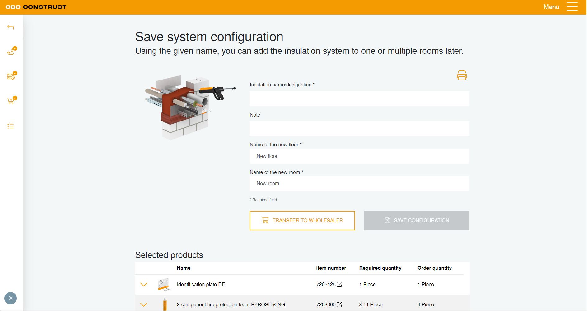 Depois de introduzir as dimensões e os meios a utilizar, a ferramenta calcula, por exemplo, a quantidade necessária de espuma ou de blocos de proteção contra incêndios. As combinações dos produtos também podem ser calculadas e os acessórios necessários podem ser adicionados de forma rápida e prática.