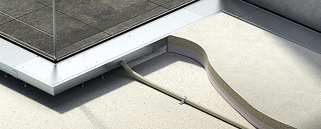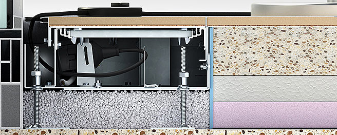 The open brush bar trunking system (OKB) is mounted on the raw concrete before the screed work. It runs along the walls for the entire length of the room. The practical fittings of the OKB system allow routing into any corner of the room. Appropriate prefabricated internal and external corners ensure uncomplicated mounting. The system can be adjusted exactly to the planned screed height using the height-adjustment feet.