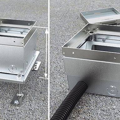 For screed laying, the housing is adjusted to the top edge of the screed, in order to simplify screed work. Supply lines into the UDHOME are run into the floor sockets using flexible installation pipes.