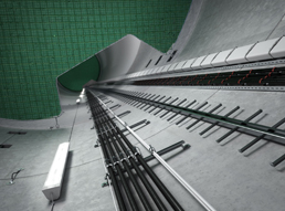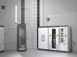 Sistemas de escadas verticais são a solução ideal para o encaminhamento na vertical. Outra opção é o encaminhamento diretamente na parede. Perfis com as respetivas abraçadeiras BBS ou também abraçadeiras individuais são fixadas diretamente à parede ou a uma estrutura em aço.
