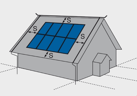 O sistema de proteção contra descargas atmosféricas deve ser montado com a distância de separação (s) relativamente aos componentes do sistema fotovoltaico, conforme a DIN EN 62305. Em geral, é suficiente uma distância de separação (s) (= distância de segurança) de 0,5 m a 1 m.