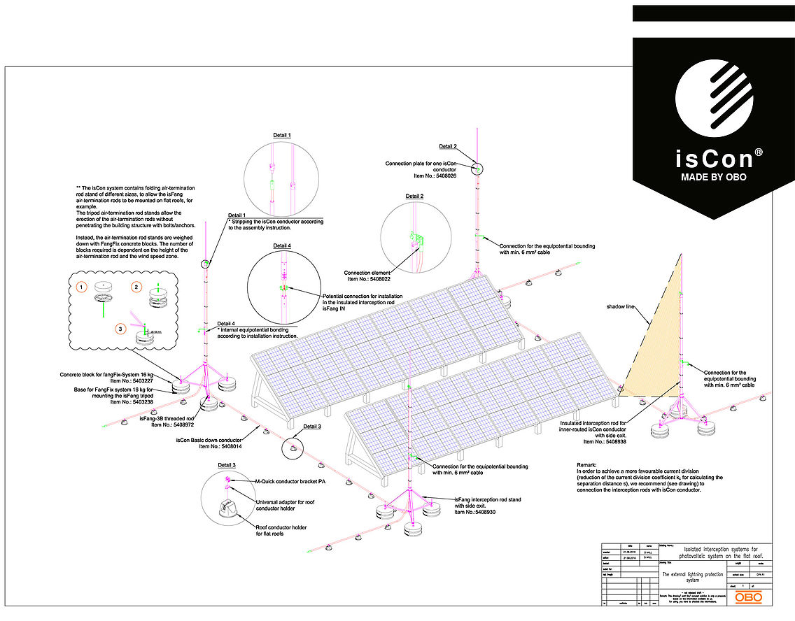 Sistemas de ar condicionado, sensores elétricos e sistemas fotovoltaicos são exemplos de estruturas em telhados, para os quais a distância de separação deve ser mantida. Esta distância é necessária para evitar a formação perigosa de faíscas e descargas atmosféricas parciais entre o sistema exterior de proteção contra descargas atmosféricas e as partes metálicas do edifício, assim como aparelhos elétricos. Em particular, na adaptação de sistemas fotovoltaicos, isto muitas vezes não é possível devido às condições estruturais. A solução segura: o sistema isCon® da OBO, isolado e resistente a elevadas tensões. Com o cabo isCon® é possível cumprir de forma segura uma distância de separação de 0,75 m no ar, assim como 1,5 m no caso de materiais sólidos.