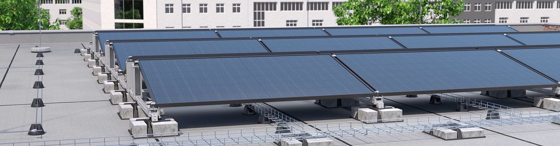 Tal como o sistema para telhados inclinados, a solução fotovoltaica Magic para sistemas em telhado plano apresenta a tecnologia Magic para uma montagem sem parafusos e sem ferramentas, bem como o grampo universal para uma fixação fácil de todos módulos fotovoltaicos habituais no mercado. Além disso, o sistema de peso UniBase garante um peso variável do sistema com a ajuda de pedras de pavimentação retangulares, em qualquer altura após a instalação. O sistema UniBase pode ser combinado com outros produtos, conforme desejado, por exemplo, com o adaptador para caminhos de cabos em varão tipo 165 MBG HGRM.